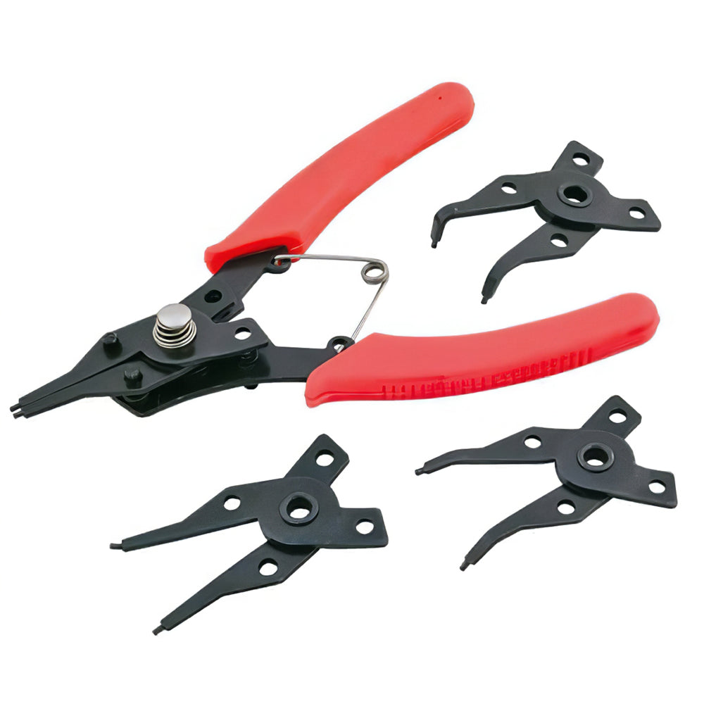 4 Head Circlip Pliers Set Combination circlip plier set for internal and external circlips two straight heads, one 90 degrees tip, one 45 degrees tip, supplied with a pair of spring loaded handles